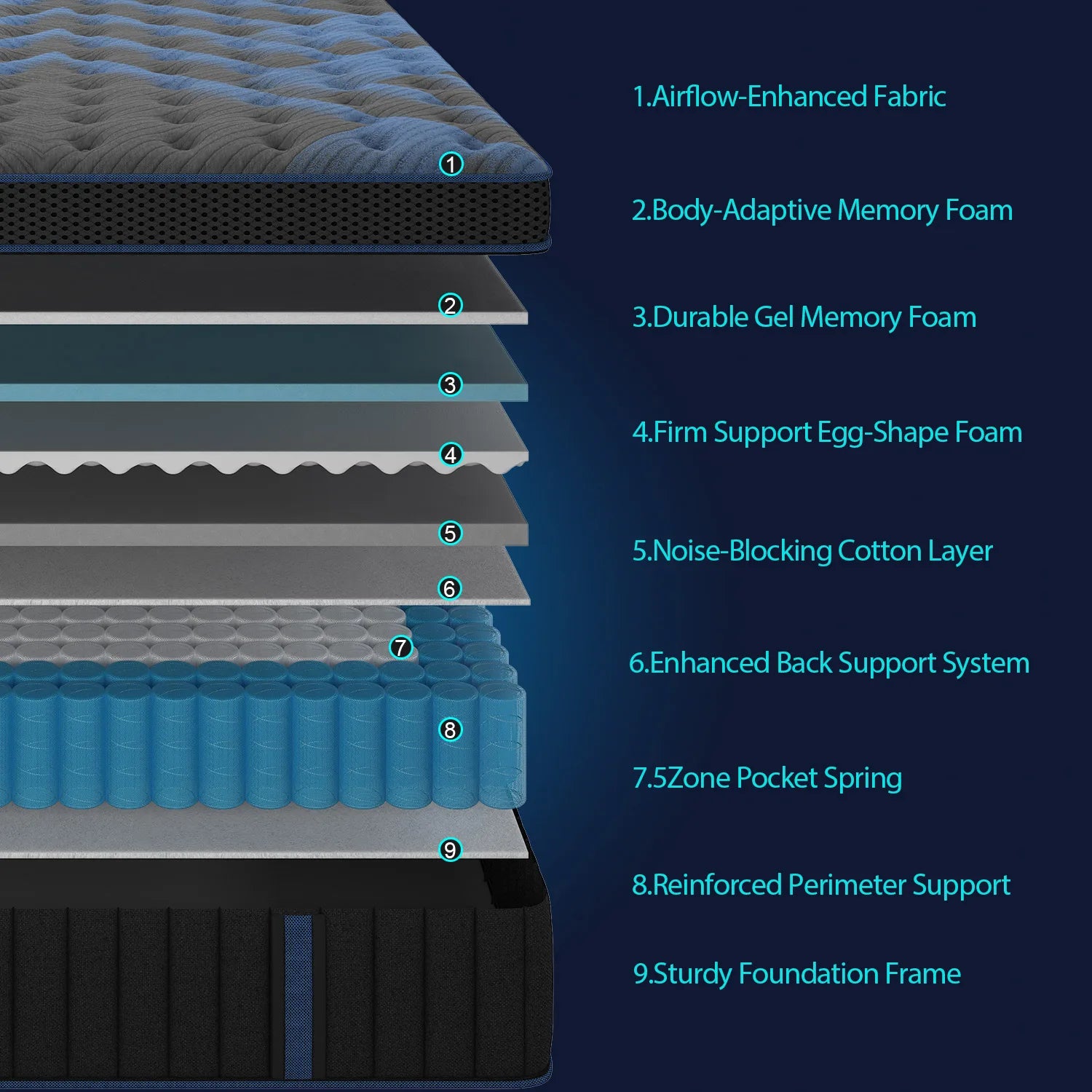 - Hybrid comfort: a cool gel memory foam layer and high-density memory foam work in harmony with individually wrapped pocket springs for adaptive, long-lasting support.