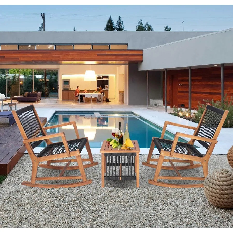 3 Piece Acacia Wood Rocking Bistro Set With All Weather Rope Woven Patio Coffee Table