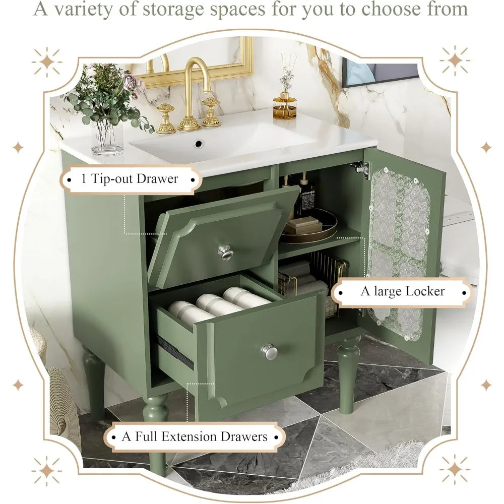 Bring a touch of cottage warmth to your bathroom with the French Country 30-Inch Vanity, a green-toned centerpiece that embraces home-and-garden charm while delivering everyday practicality.