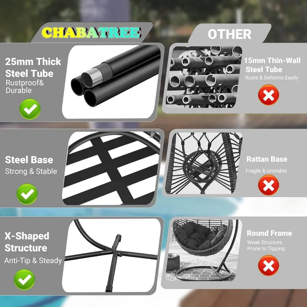 Egg Chair With Stand blends modern design with rugged durability for standout comfort both indoors and outdoors. Built on a sturdy aluminum frame and wrapped in weatherproof rattan wicker, this swing chair delivers long-lasting performance and chic style. With a weight capacity of up to 350 pounds, it’s designed to support you and your guests season after season.