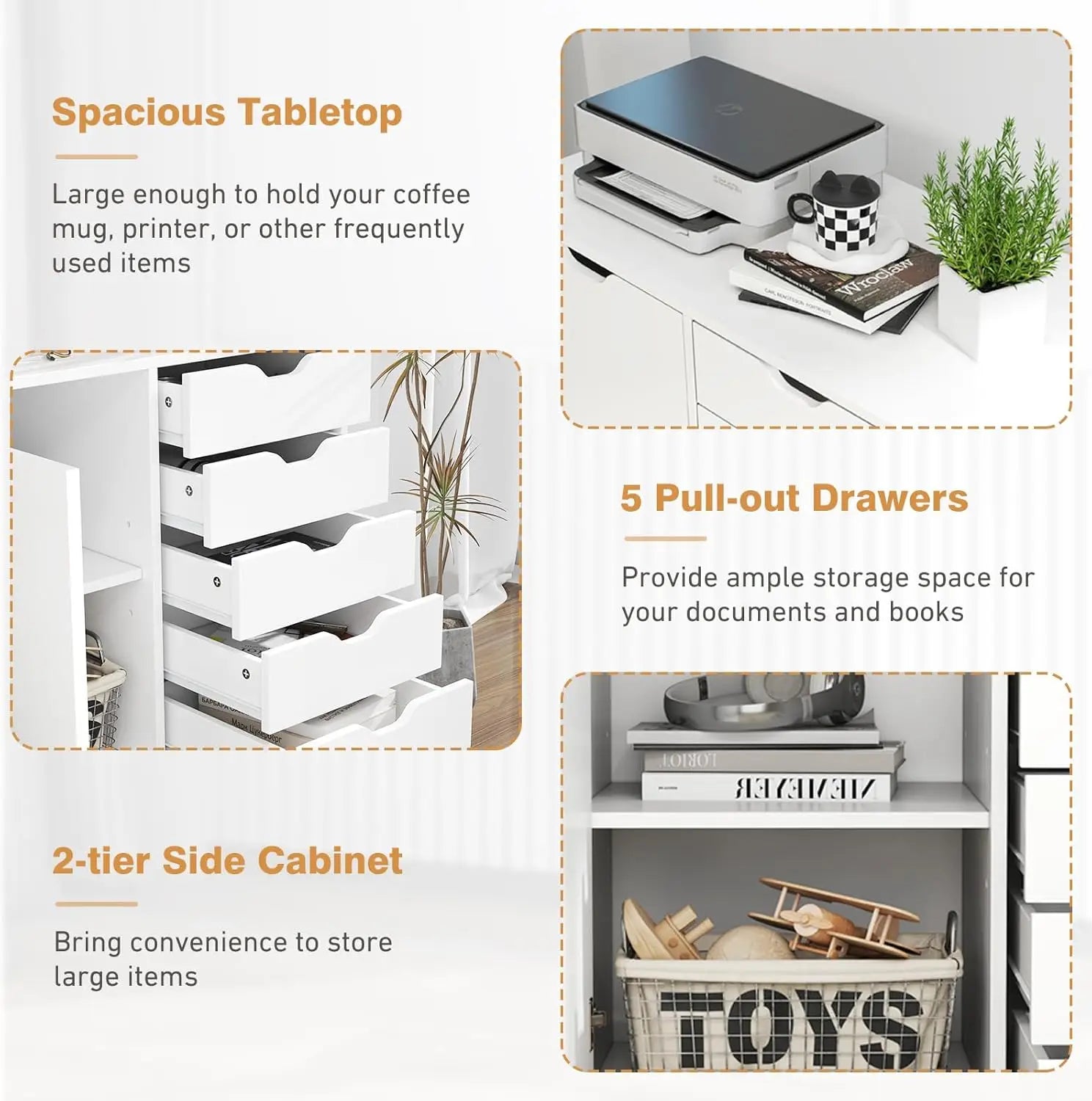 - Ample storage: 1 cabinet and 5 drawers organize files and supplies; the top surface is ideal for frequently used items.